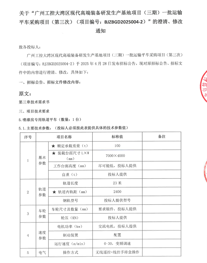 广州工控大湾区现代高端装备研发生产基地项目(三期)一批运输平车采购项目(第三次)澄清、修改通知